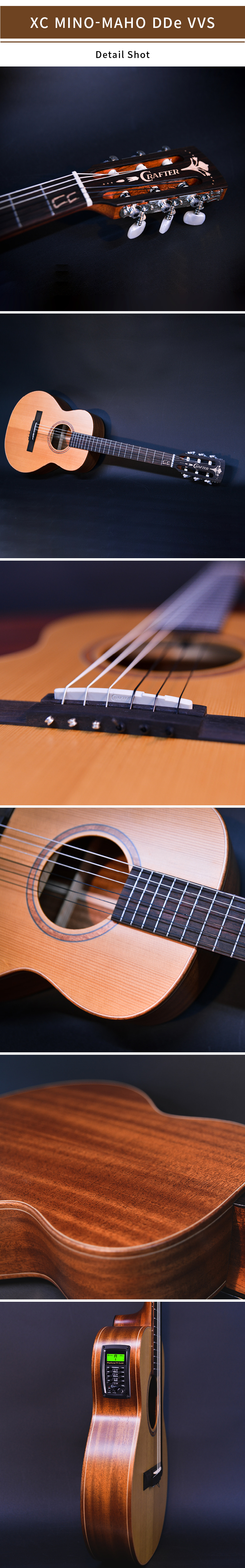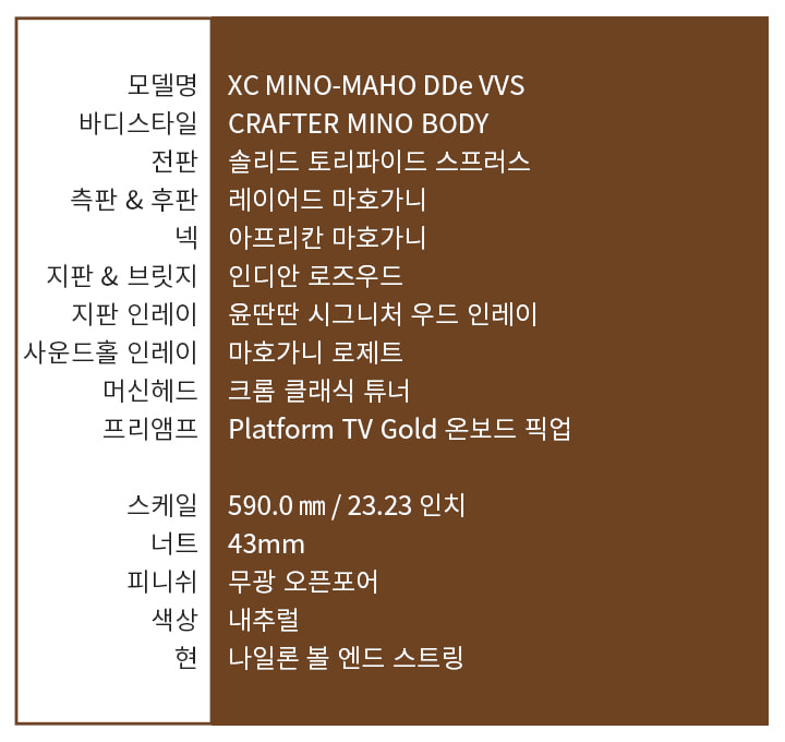 XC MINO-MAHO DDE VVS 는 손 쉬운 현 교체와 관리를 위한 나일론 볼 엔드 스트링이 장착되는 클래식기타입니다.